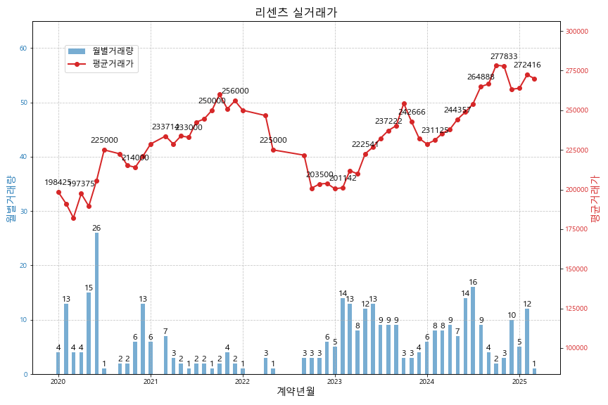 2021년, 2024년 거래량 증가 시점에서 실거래가 상승이 뚜렷하며,